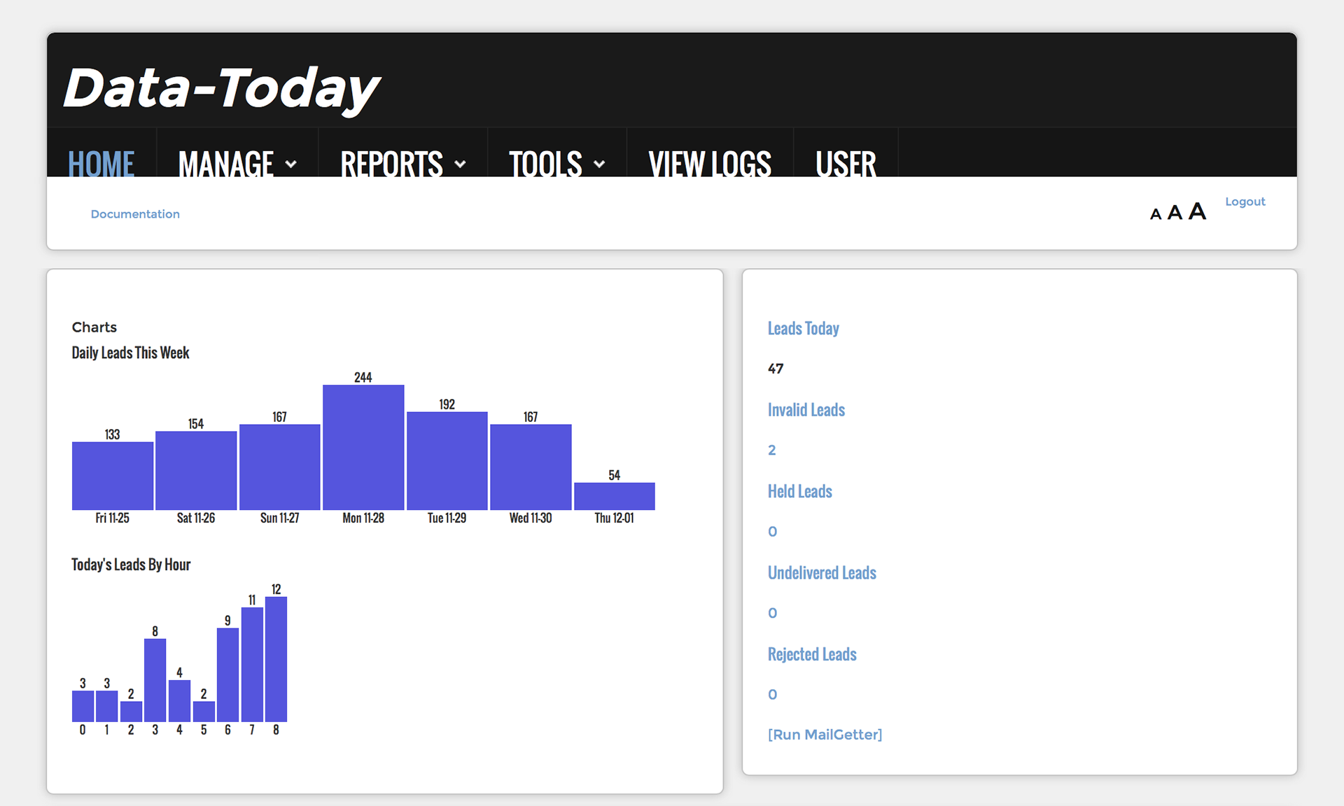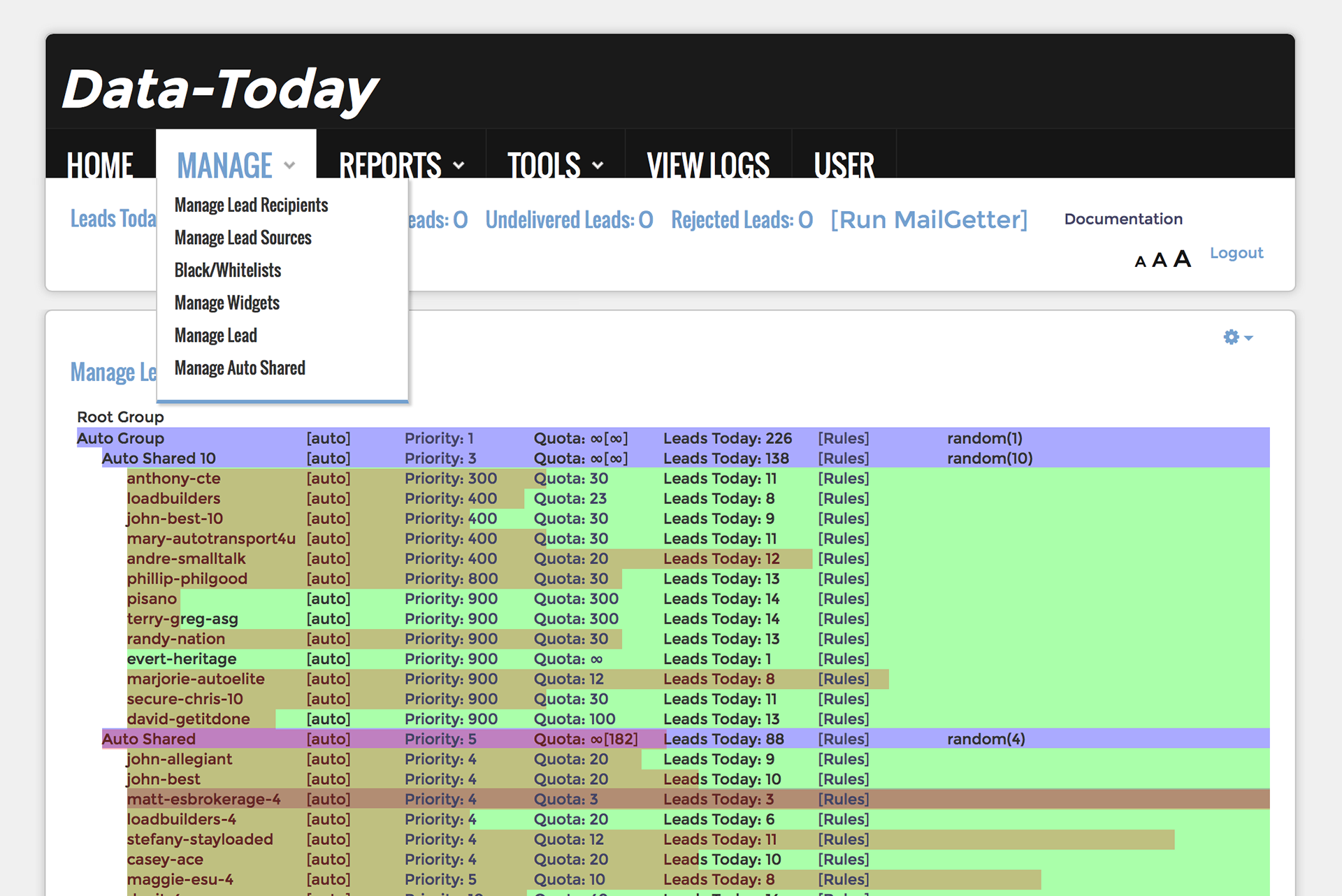 Data-Today is the core lead routing system and internal toolbox for Taylor Online Marketing. From data tracking, to lead source and receipient management, to generation of affiliate widgets, data-today is the hub for TOLM's lead-generation business.
